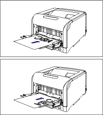- When loading paper in landscape orientation, such as when loading A4, B5, A5, Statement, Letter, Executive, or 16K size paper, load the paper so that the printing side is facing down as shown in the following figures.