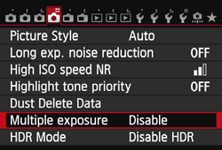 - If the power switch is set to <OFF> or the battery is replaced after you set multiple exposure settings, multiple-exposure shooting will be canceled.