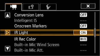 ] -> [IR Light] -> [ON] to turn on the infrared light during infrared recording.