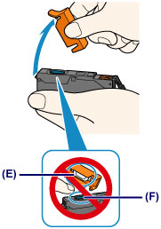 - Do not touch the inside of the orange protective cap (E) or the open ink port (F). The ink may stain your hands if you touch them.