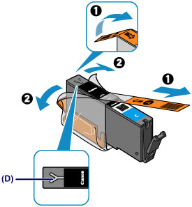 - If the orange tape remains on the Y-shape air hole (D), ink may splash or the machine may not print properly.