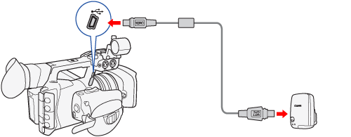 Turn off the camcorder and the receiver. Connect the receiver to the camcorder's USB terminal using the USB cable*. While recording, place the receiver in the carrying case* and attach it to the camcorder's grip belt or carry it on your person. For details about connecting and using the receiver, refer to the GP-E2 Instruction Manual.