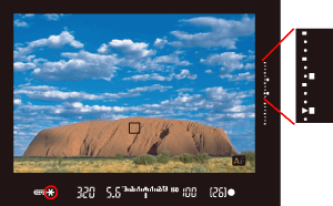 The exposure level indicator on the right of the viewfinder will show the AE lock exposure level and the current exposure level in real-time.