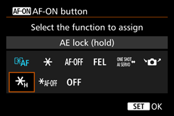 When you press the button assigned to this function, you can lock the exposure (AE lock). The AE lock will be maintained until you press the button again. Convenient when you want to focus and meter the shot at different areas or when you want to take multiple shots at the same exposure setting.