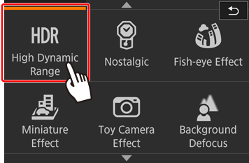 | Applying Special Effects | Shooting High-Contrast Scenes | [High Dynamic Range] ( ) | Three consecutive images are captured at different brightness levels each time you shoot, and the camera combines image areas with optimal brightness to create a single image. This mode can reduce the washed-out highlights and loss of detail in shadows that tend to occur in high contrast shots. | |