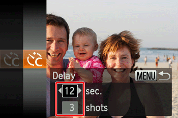 You can specify the delay (0 – 30 seconds) and number of shots (1 – 10).