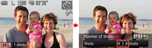 ] (INFO. button) to access the [Number of shots] screen, press the [