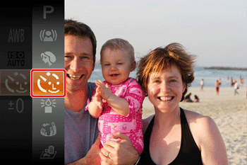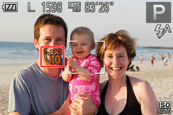 The camera will shoot about two seconds after detecting that the face of another person (such as the photographer) has entered the shooting area. This is useful when including yourself in group photos or similar shots